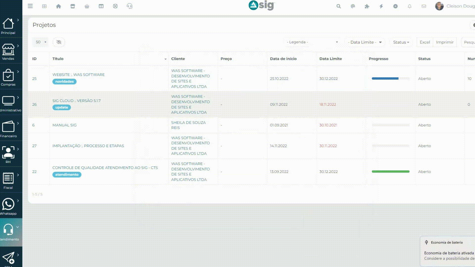 Acompanhe o prazo de tarefas relacionadas à projetos.